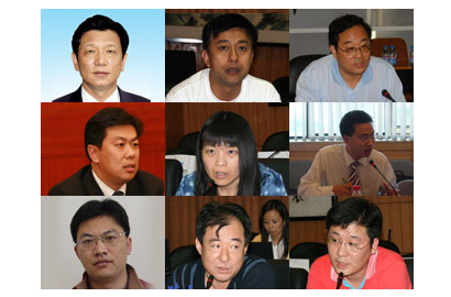 北京海淀留学人员创业园副主任王世琦(上一);中关村生物医药园总经理刘荣耀(上二);北京科大留学人员创业园主任刘临(上三);北航留学人员创业园主任李军(中一);北京经济技术开发区(汇龙森)留学人员创业园总经理汪辉(中二);春晖兴业投资公司副总经理董刚(中三);天津高新区海外留学生创业园副主任孙大勇(下一);北京技术交易促进中心陈贵如博士(下二);《中国留学生创业》杂志社总编辑郎靖(下三)